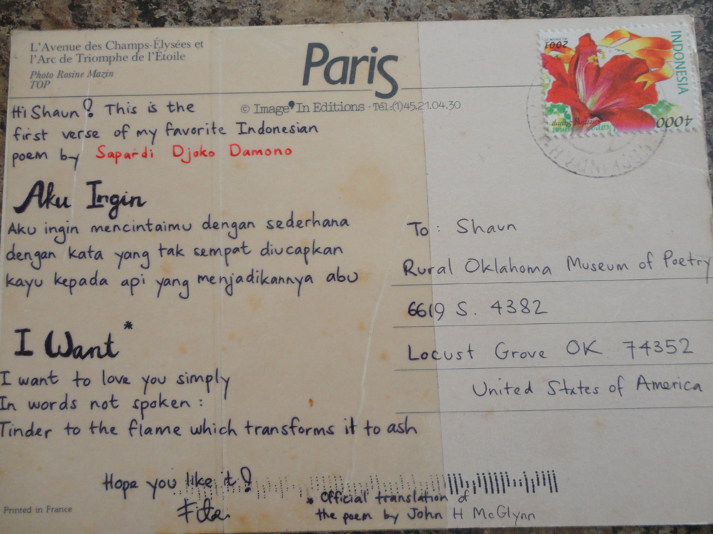 from Paris (or Indonesia) with Love Posted on December 5, 2013 by ROMPoetry Leave a comment Fitri, who lives in Jakarta, sent this beautiful poem with its translation. The Paris postcard made me remember my trip there last year, and the poem just makes me . . . love poetry even more. Thank you, Fitri! Share this: Click to share on X (Opens in new window) X Click to share on Facebook (Opens in new window) Facebook Like Loading... Related