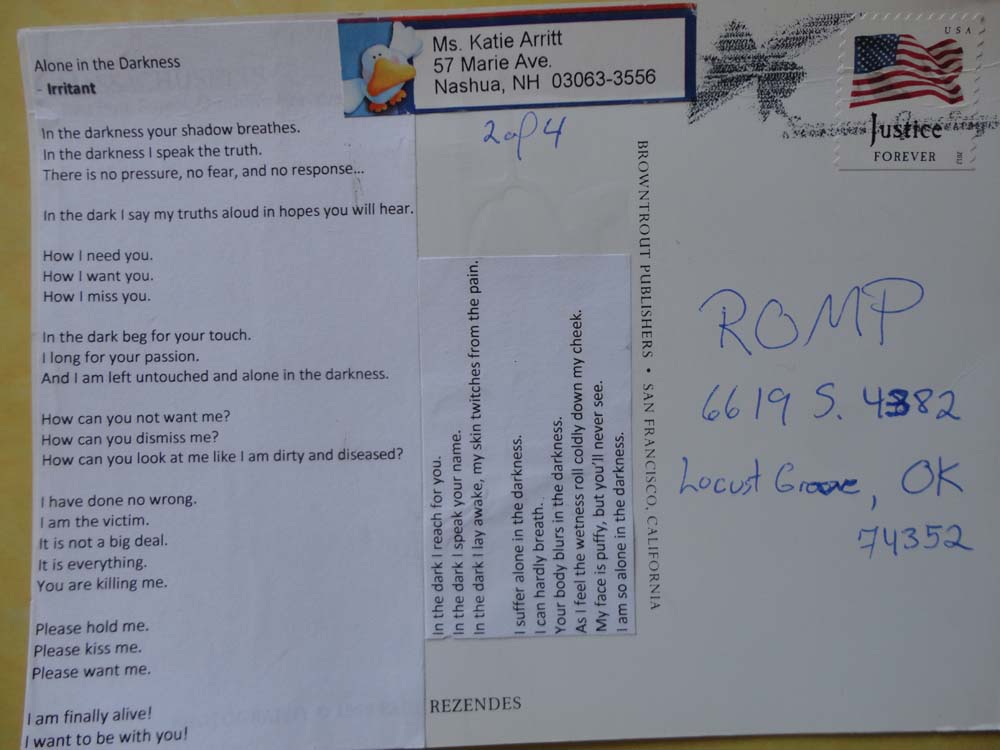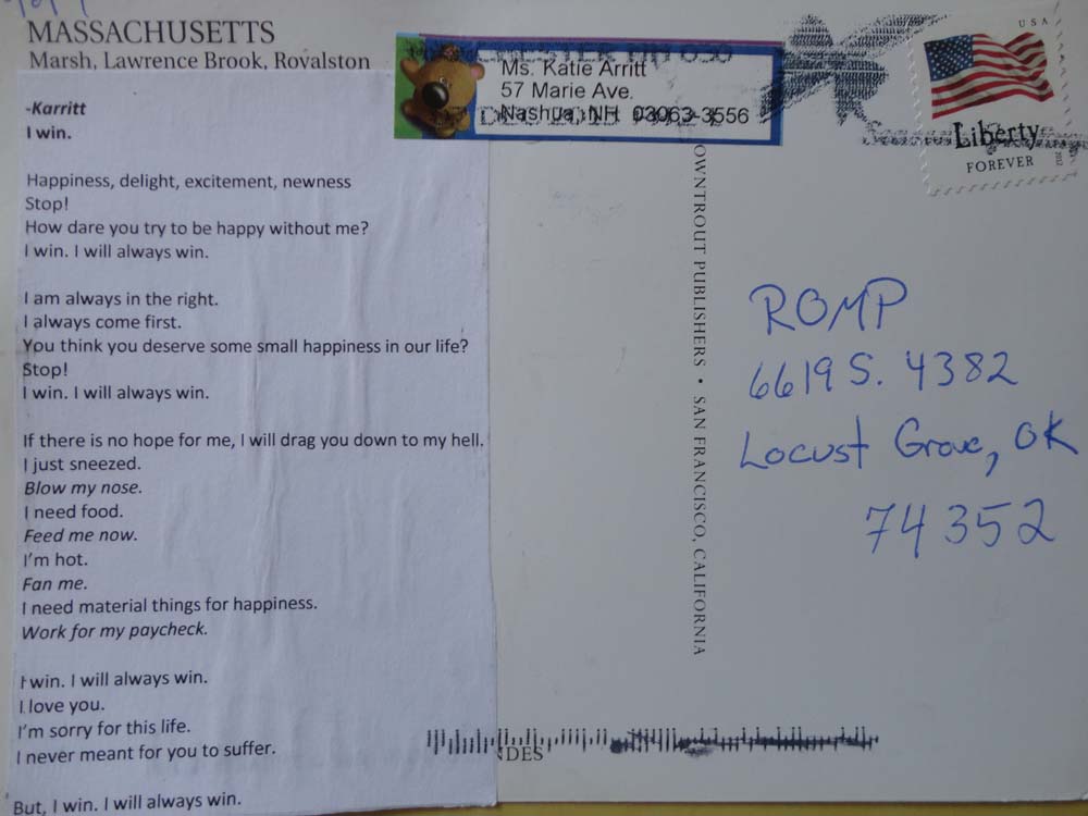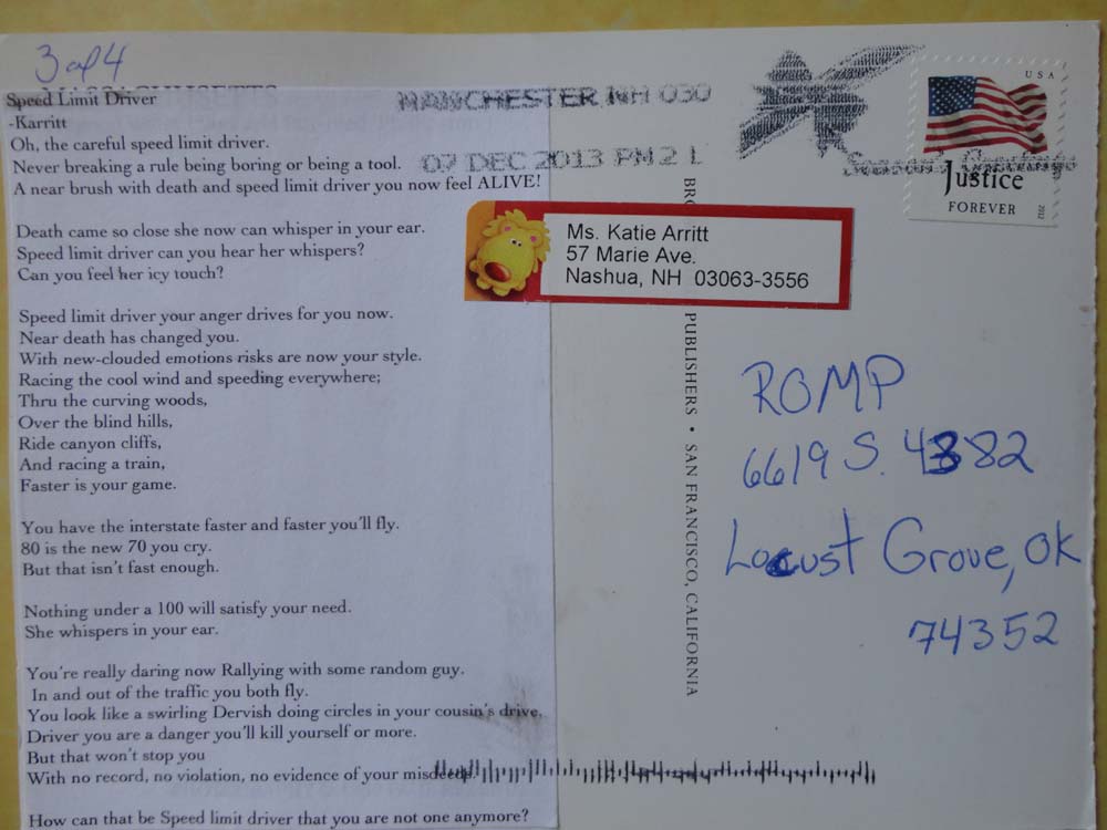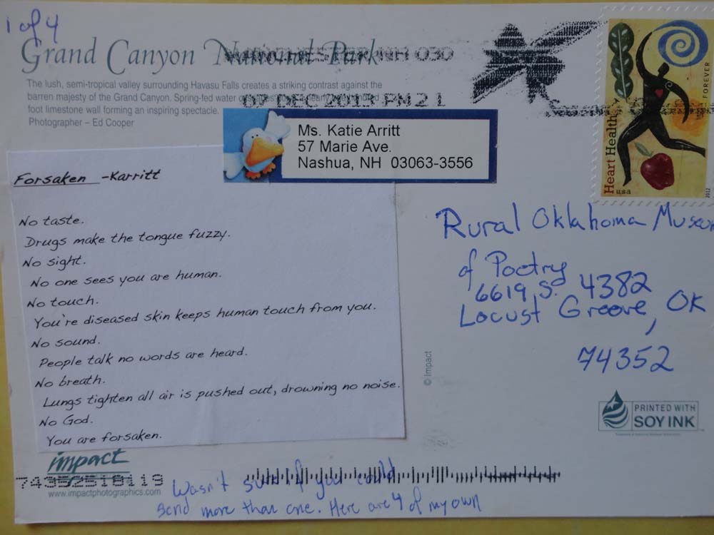 I received 4 beautiful postcards from Katie in New Hampshire. the landscapes of Massachusetts on 3 of them and the Grand Canyon on one. Each of Katie’s poem tells a different story, a different feeling and mood. They are evocative and resonant. Thank you, Katie!